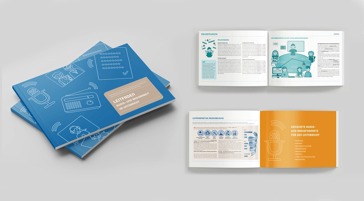 Der Leitfaden für Audio- und Radioarbeit fasst alle Infos zusammen, damit Schüler Audioprojekte im Unterricht umsetzen können. Unterschiedliche Bereiche sind farbkodiert, ergänzt durch Infografiken, die komplexe Sachverhalte einfach erklären.